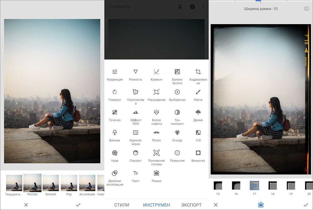 Одна из лучших программ для обработки фото на Андроид. Snapseed предлагает каталог готовых фильтров, которые позволят улучшить кадр одним нажатием. Также есть инструменты для ручного редактирования яркости и контрастности, баланса белого, резкости и т.д.