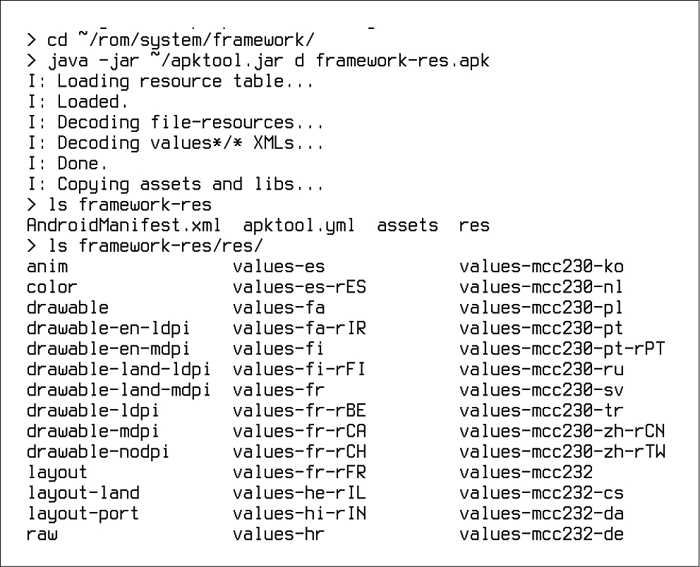 В результате в текущем каталоге должен появиться каталог framework-res, содержащий все файлы пакета. Наиболее интересные подкаталоги внутри него — это res/drawable-* и res/layout-*. Первый содержит все графические элементы в виде png-файлов для разных разрешений и положений экрана. Например, drawable-land-mdpi — это каталог с графическими ресурсами для экранов среднего разрешения, находящихся в горизонтальном положении (во время поворота экрана ОС переключается на использование других файлов). Разумеется, любой файл можно отредактировать или заменить другим.