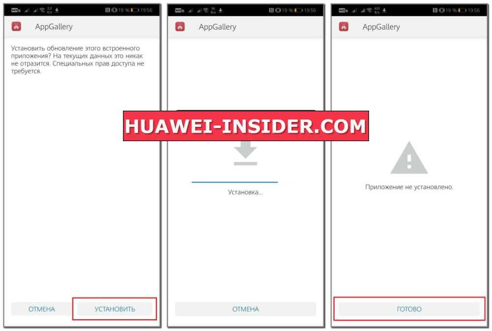 - Подтвердить установку. В представленном скриншоте установка не удалась, потому что AppGallery была представлена и обновления осуществляются по воздуху. В смартфонах, где ее не было изначально, установка программы будет осуществлена.