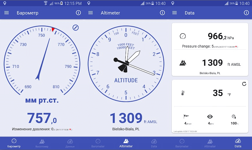 Согласитесь, что это достаточно интересное приложение и определенно заслуживает внимания. Представьте себе, насколько было бы здорово установить барометр и, поднявшись на крышу небоскреба, с легкостью определить высоту и атмосферное давление.