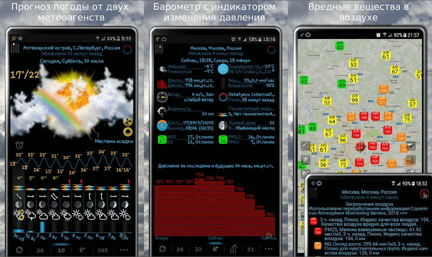 Все они функционируют по схожему принципу – требуют подключения к GPS, интернету, посредством чего получают инфо со спутников, ближайших метеорологических лабораторий. Затем измеряют давление, собирают всё в кучу, анализируют и позволяют получить крайне точный погодный прогноз. А некоторые проги даже высоту измеряют.