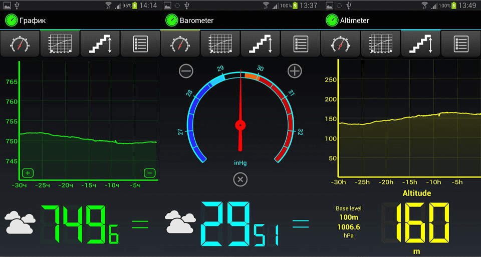 BarometerPlus. Помимо атмосферного давления, изменяет температуру и влажность воздуха (если это функции поддерживает телефон). Ведет историю и уведомляет пользователя об изменениях показателей. Получает и анализирует информацию с датчиков устройства и ближайших метеостанций. Поддерживает множество единиц измерений. Имеет функцию калибровки сенсора и набор красивых тем оформления.