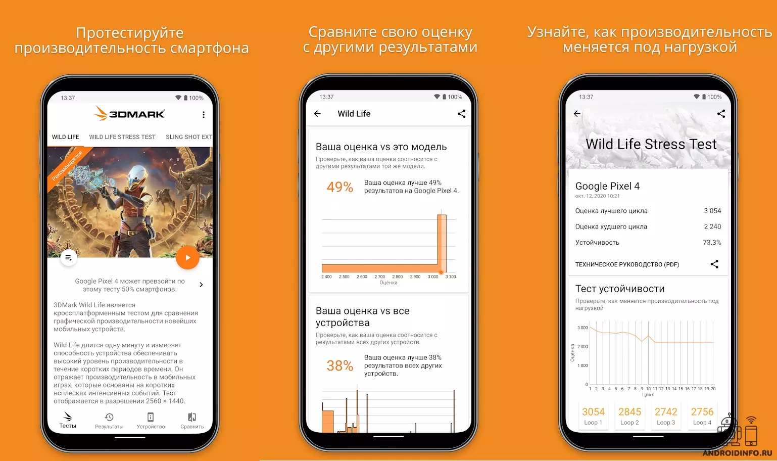 Бенчмарк с тестами, которые показывают скорость устройства под большой нагрузкой. Еще дает статистику, как менялась скорость смартфона с каждым обновлением ОС