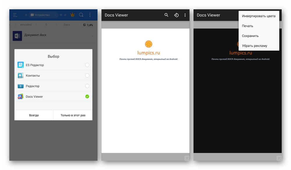 Совет: некоторые «читалки» (например, AlReader) совместимы с .docx файлами и подходят для просмотра простейших текстовых документов (без таблиц, изображений). Если у вас уже установлено подобное приложение, то сперва попробуйте воспользоваться им.