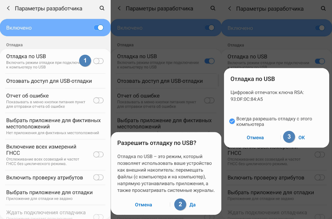Активируйте функцию «Отладка по USB» в разделе «Для разработчиков». Если такого раздела нет, нужно предварительно включить его отображение, несколько раз кликнув по номеру сборки во вкладке «О телефоне».