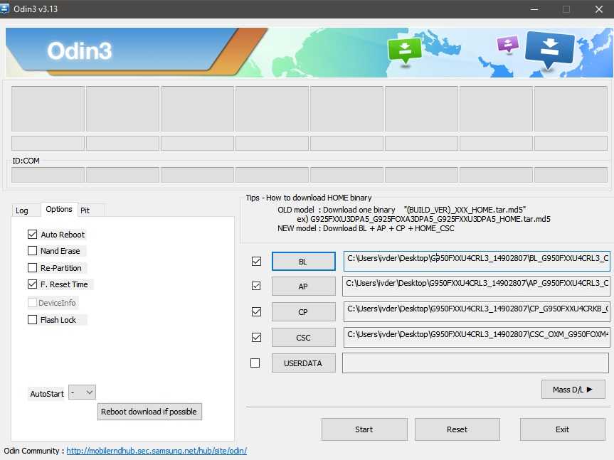 - Запускаем Odin и в соответствующих полях программы по очереди указываем путь к частям прошивки (Bl, AP, CP и при наличии CSC).