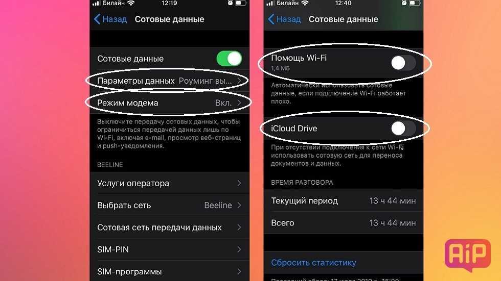 - Там же найдите «Помощь wi-fi» и «iCloud drive» и отключите их тоже. Первая заставляет сотовые данные «помогать» слабому wi-fi, чтобы вы наслаждались пребыванием в интернете без перебоев. Включённый «iCloud drive» будет использовать мобильный интернет для переноса файлов в iCloud. Конечно, за границей вам не нужно ни первое, ни второе.