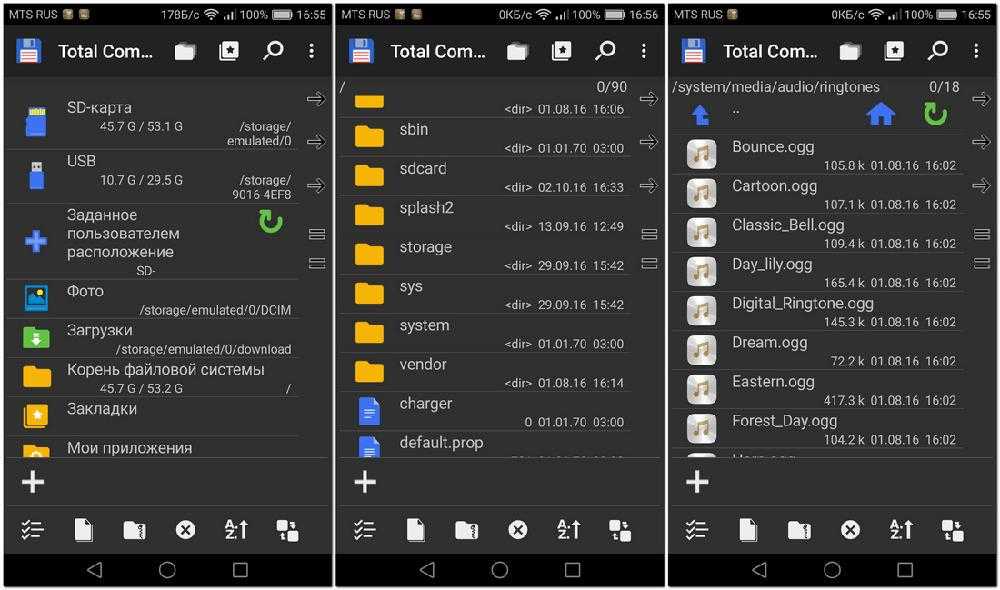 Файловая система Андроид-устройств организована несколько иначе, чем привычная Windows. В корневой каталог можно попасть из файлового менеджера (обычно он называется «Проводник», «File Commander», «Total Commander»). Далее появятся доступные разделы памяти, данные в них организованы следующим образом: