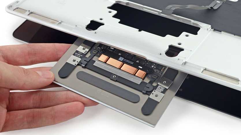 Портал iFixit уже разобрал «на винтики» MacBook Pro 2015 года с новым тачпадом. Как выяснилось, трекпад состоит из четырех катушек с ферромагнитными сердечниками (чем их больше, тем больше «ощущений» для пользователя) и специальных «датчиков усилия».