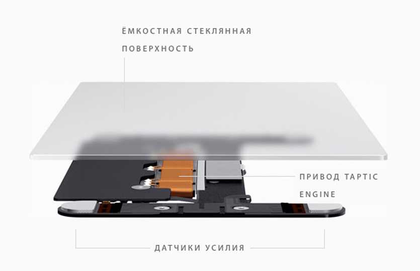 С тактильным откликом вы думаете, что слышите клик и «продавливаете» трекпад… но на самом деле тачпад никуда не опускается, а по воле Taptic Engine (о нём см. ниже)… сдвигается в сторону! При выключенном компьютере стеклянная панель после нажатия лишь слегка подастся вниз (чуть заметнее – у края, практически незаметно – в центре).