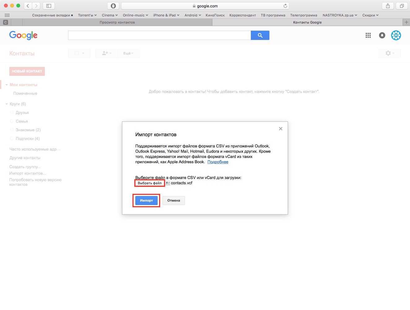 В сплывающем окне нажмите кнопку Выбрать файл и укажите место с резервной копией контактов, после чего нажмите Импорт. Через несколько секунд все ваши контакты появятся на странице