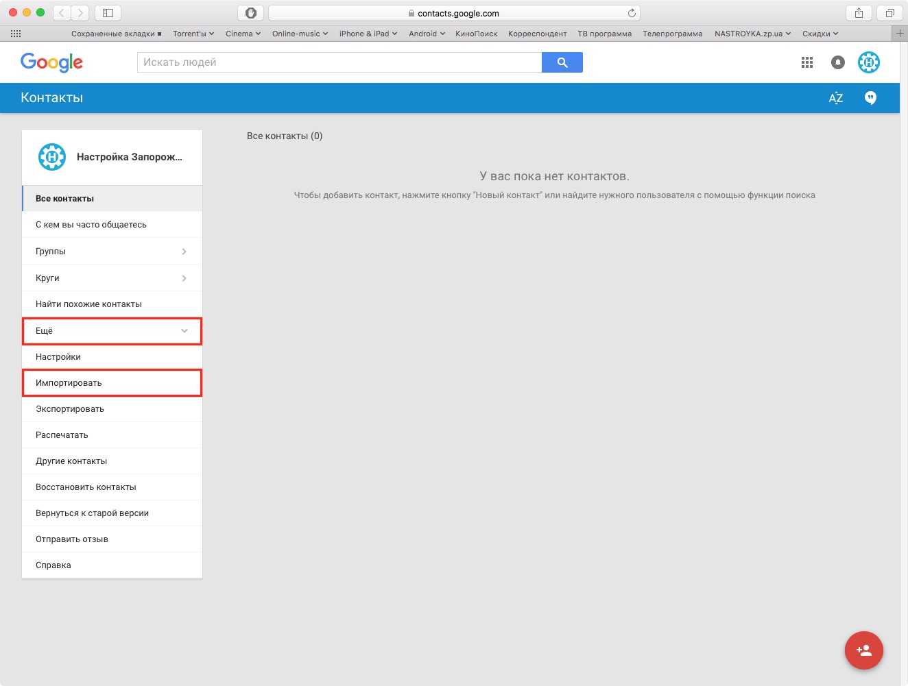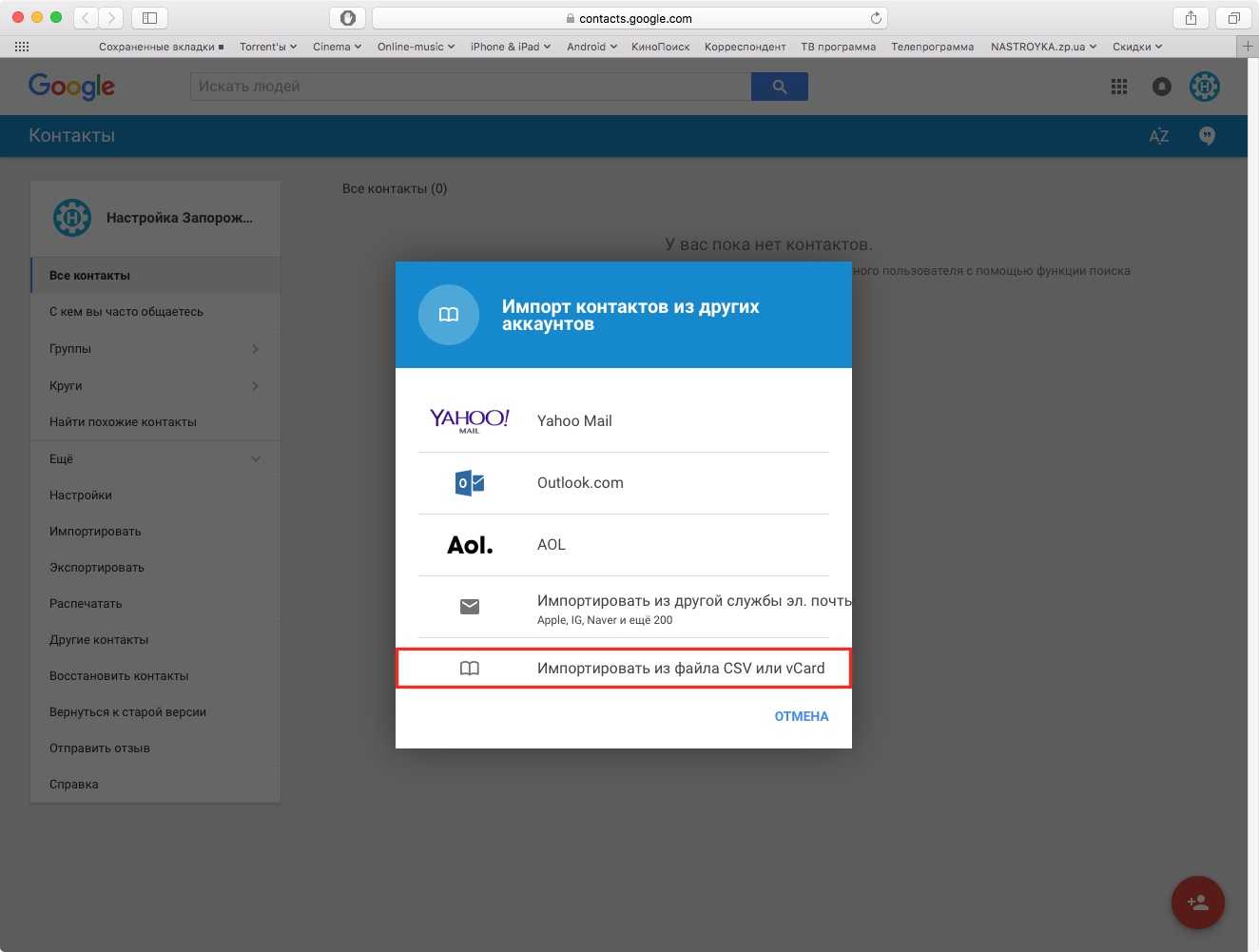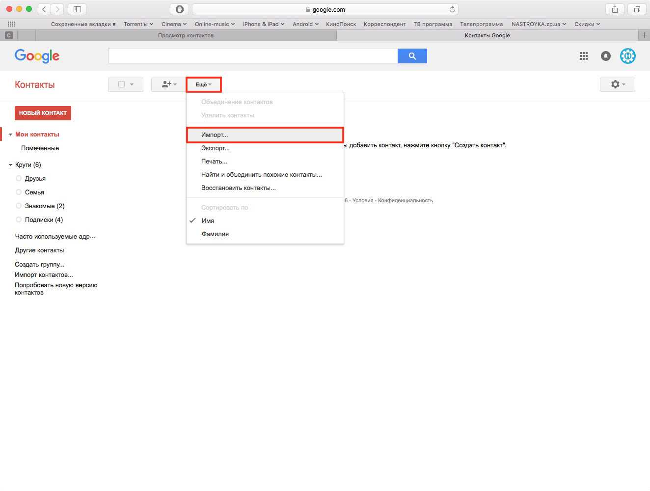 - Теперь нужно загрузить контакты в Гугл аккаунт. Зайдите в него, выберите «Ещё» – «Импортировать». Откроется окно, где кликните по пункту «Импортировать из файла CSV или vCard».