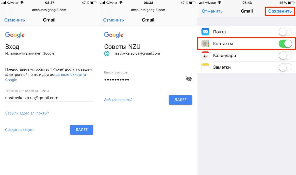 Введите свою электронную почту Gmail и пароль от нее, после каждого действия нужно нажать кнопку Далее. Теперь передвиньте ползунок на пункте «Контакты» вправо для его активации и нажмите кнопку Сохранить