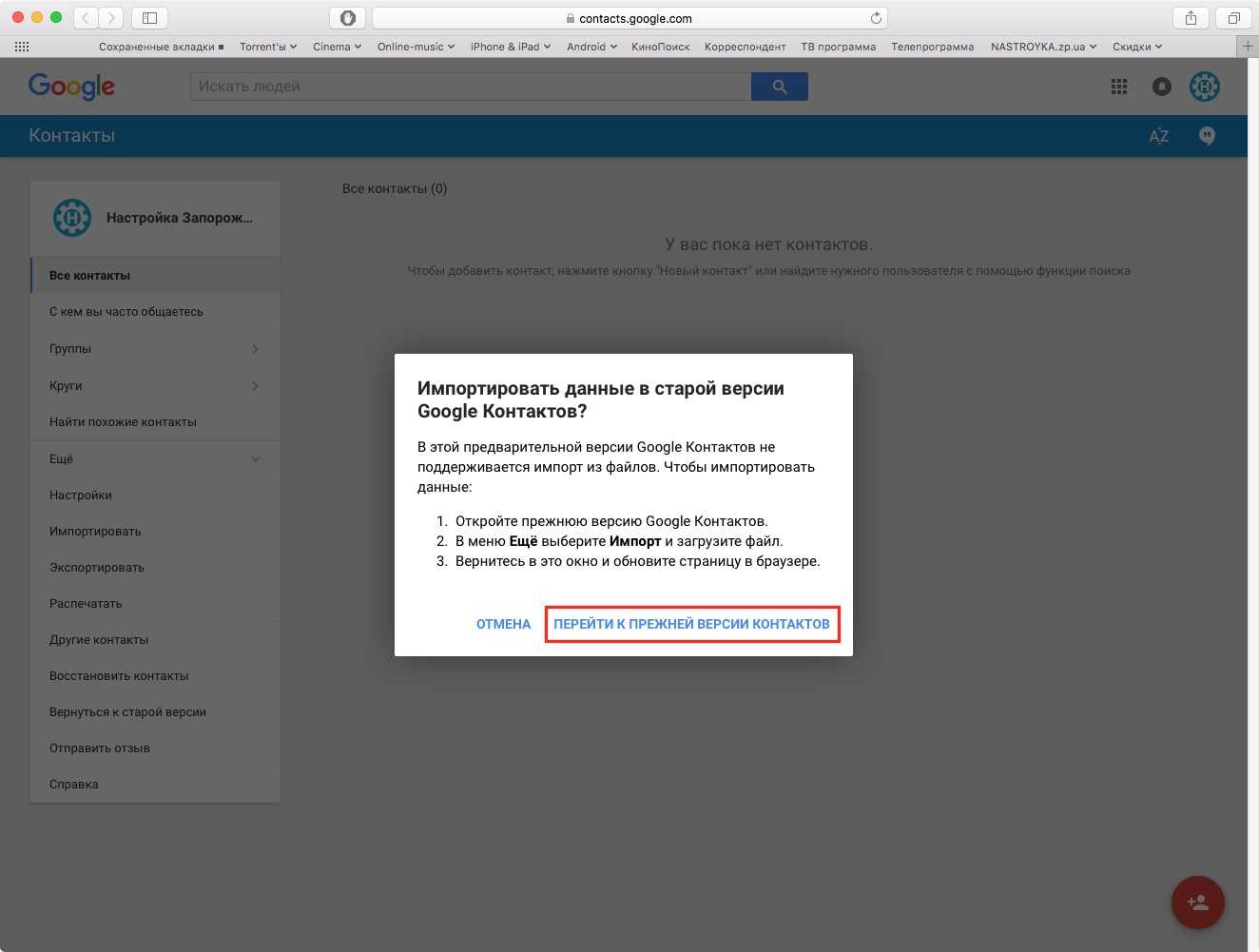 Новая версия Контактов Google лишена возможности импорта из данных форматов, поэтому нужно перейти в старую версию программы, для этого нажмите Перейти к прежней версии контактов
