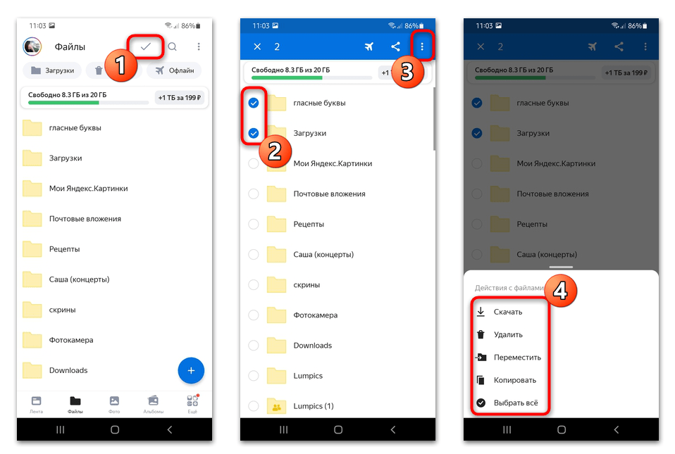 Раздел располагает расширенными средствами для более удобного использования Яндекс.Диска. Иконка в виде галочки вверху обозначает режим выделения объектов. Нажмите на нее, чтобы у папок и файлов появились чекбоксы, отметив которые, можно производить с выбранными загрузками различные действия. Перечень доступных для управления функций находится в меню, раскрывающееся тапом по вертикальному троеточию вверху.