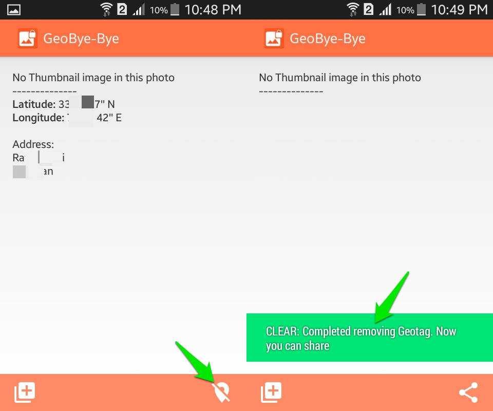 Если геотег обнаружен, нажмите на иконку GPS с перечеркнутой линией на нем в правом нижнем углу экрана. Приложение создаст копию изображения, и новая копия не будет содержать информацию о местонахождении. Используйте новую копию и удалите оригинальное изображение.