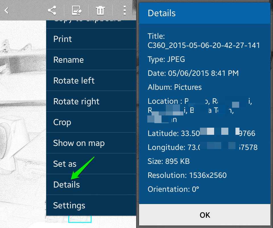и вы увидите всю информацию, касающуюся фото, вместе с его координатами местоположения.