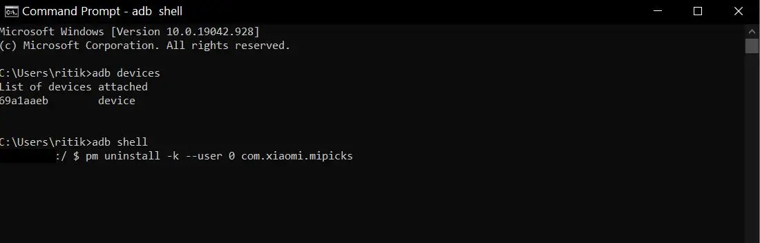 - Введите следующую команду: «Pm uninstall -k –user 0 com.xiaomi.mipicks«