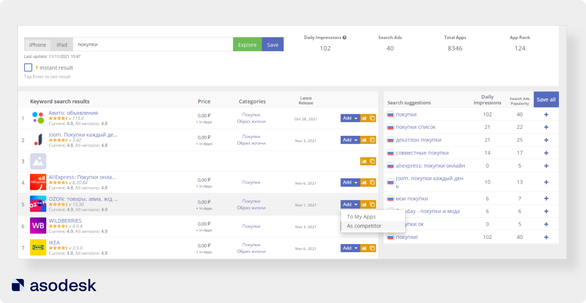 Для этого отберите минимум 5 конкурентов и проведите анализ их текстовых и визуальных метаданных. С поиском конкурентов вам может помочь инструмент Keyword Explorer в Asodesk.