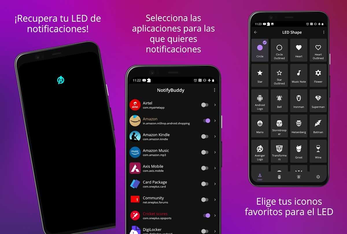 Когда вы откроете приложение, появится панель со всеми приложениями, установленными на вашем мобильном телефоне. В нем вам нужно будет выбрать те, которые вы хотите активировать светодиодом уведомлений. Затем вы пойдете на выбрать дизайн светодиода можно выбрать от простого круга до фигуры вашего любимого супергероя . Кроме того, вы можете изменить его положение на экране, цвет и даже время появления.