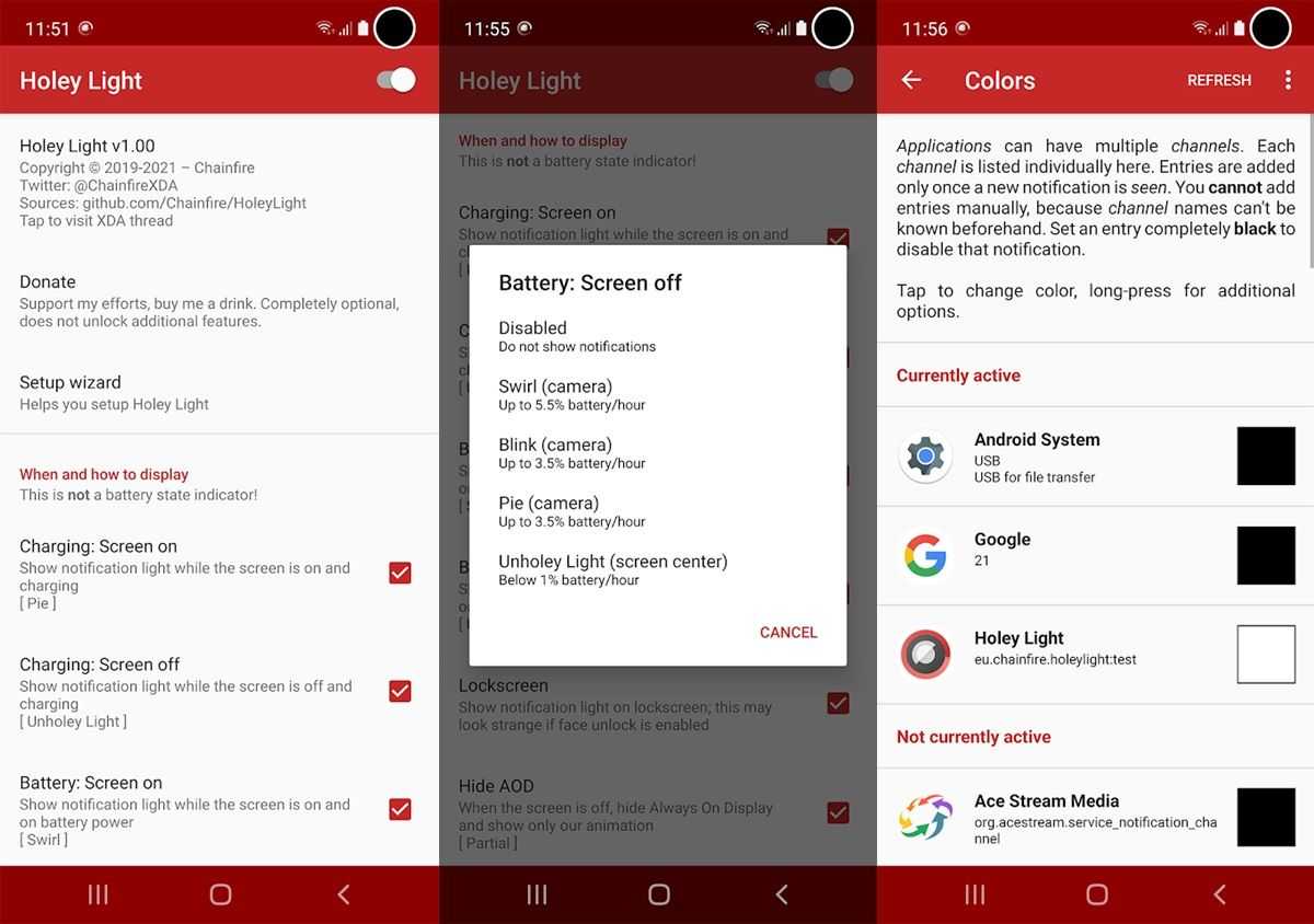 Это еще одно очень настраиваемое приложение, которое также предлагает четыре режима уведомлений (Swirl, Blink, Pie и Unholey Light). Но это не только дает вам возможность изменить цвет светодиода, вы также можете настроить положение, размер и скорость мигания . Кроме того, это один из немногих поддерживает функцию Always on Display , а это значит, что они могут работать одновременно без проблем.