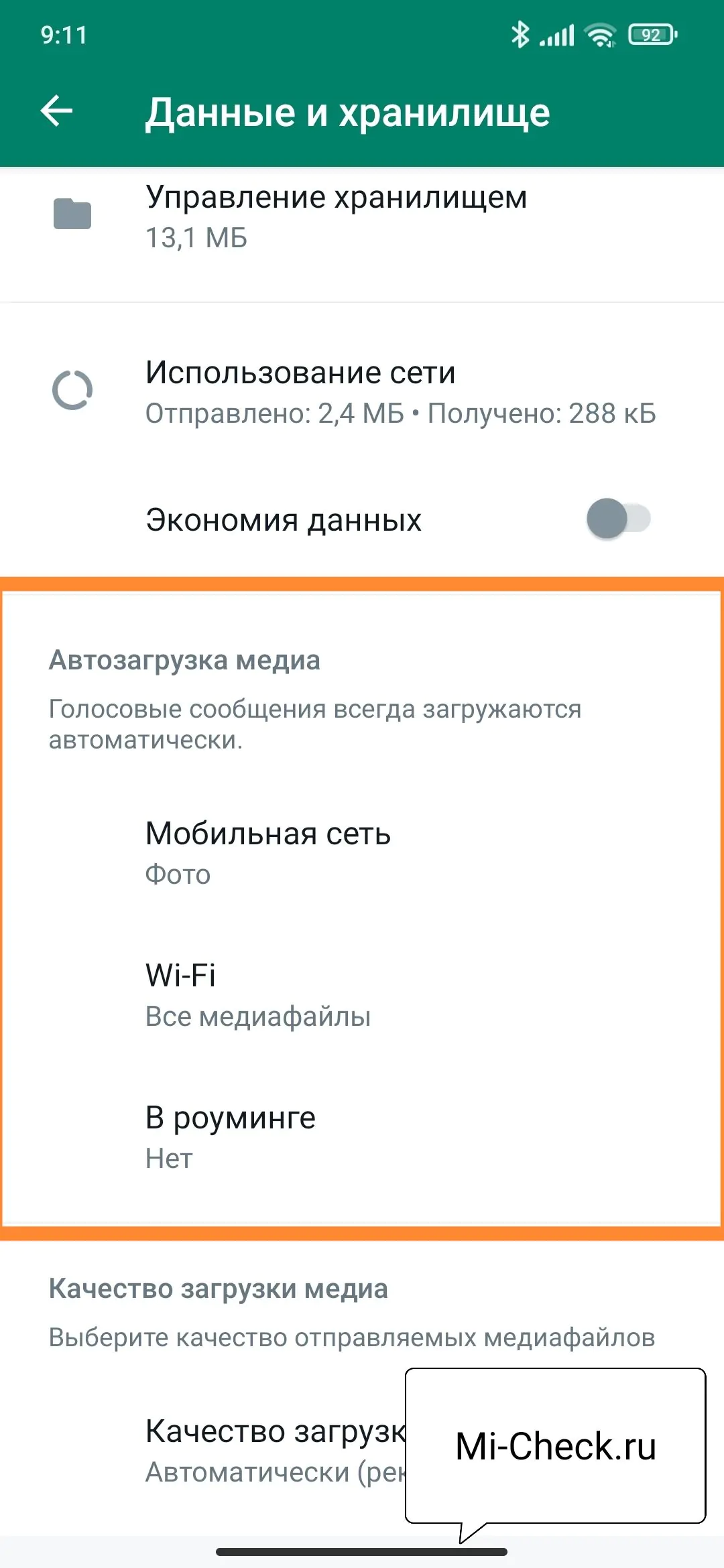 Обратите внимание на эту настройку, её можно найти, если войти в настройки WhatsApp, нажать на меню «Данные и хранилище». «Автозагрузка медиа»