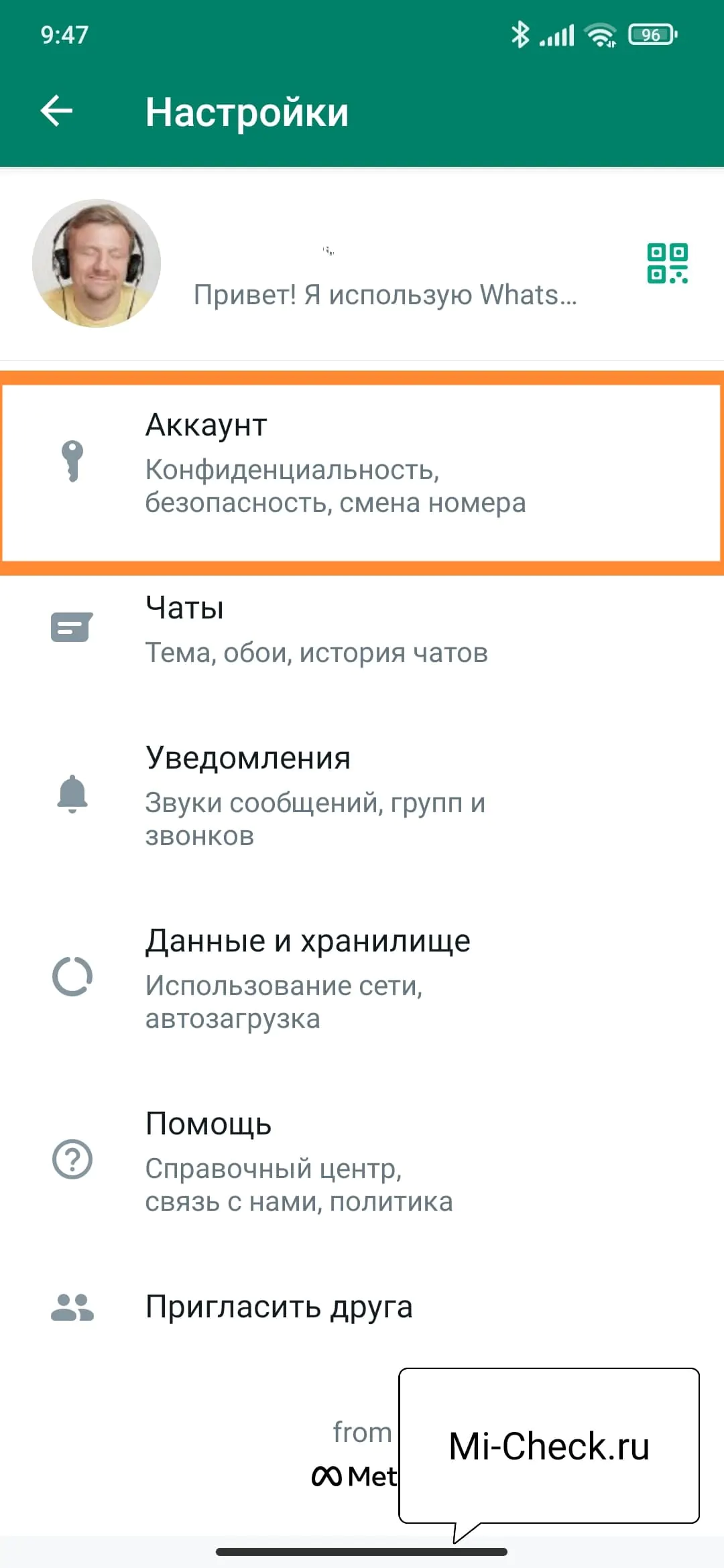 Откройте настройки приложения, найдите меню «Аккаунт».
