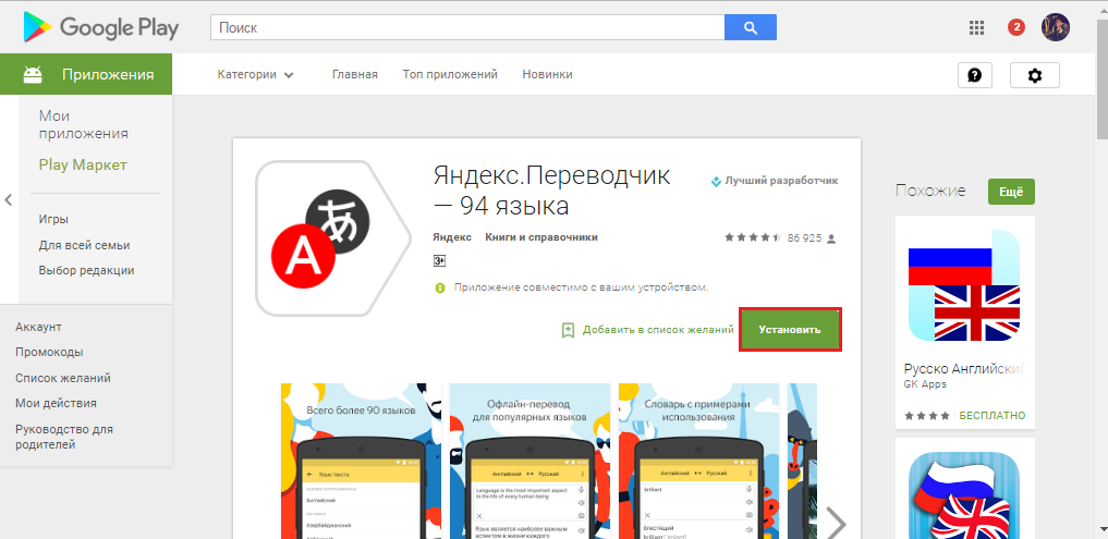 Шаг 2. После входа в аккаунт на странице приложения «Яндекс.Переводчик» точно так же, как и в приложении Play Market, нажмите кнопку «Установить». Предварительно убедитесь, что наверху имеется надпись «Приложение совместимо с вашим устройством».