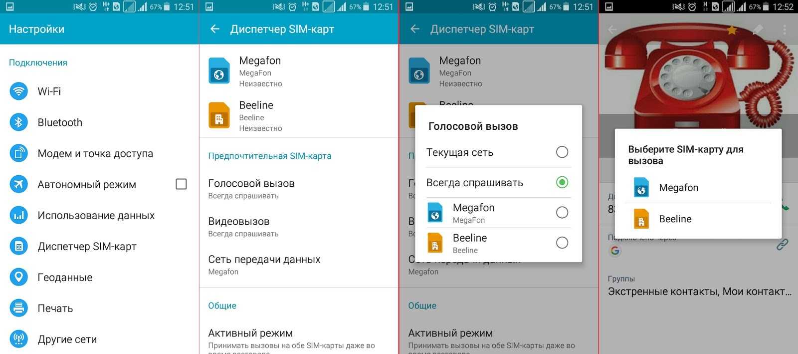 В настройках можно выбрать, какая из установленных симок будет приоритетной для звонков, обмена SMS, передачи данных. Однако даже в этом случае, можно в любой момент выбрать для звонка или SMS другой номер.