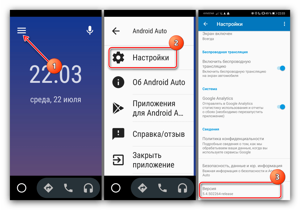 - Если вы используете Android 9 или более раннюю версию ОС, откройте приложение Android Auto. Если у вас Android 10 или 11, запустите приложение «Android Auto на экране телефона».