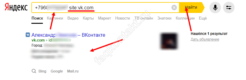- Введите в поисковое окно нужный номер, а после него комбинацию site:vk.com