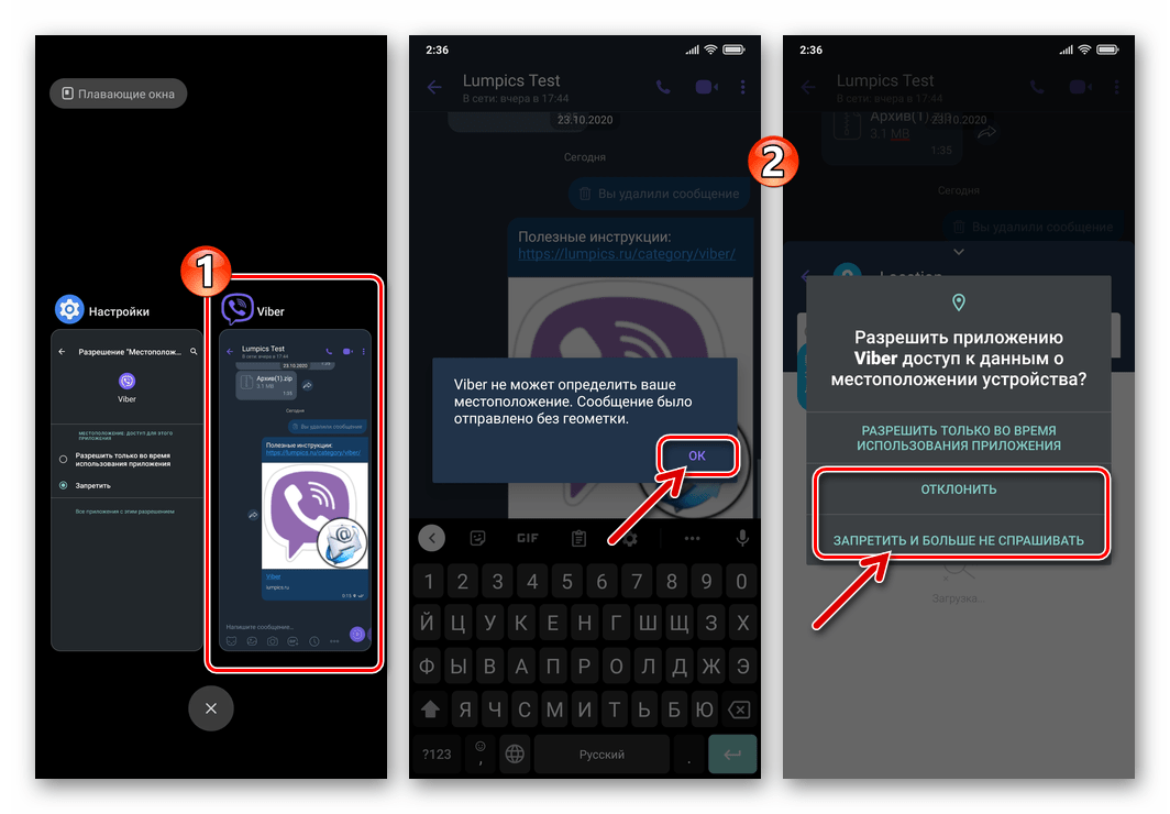 - Запустить Viber, — отныне доступ к модулю определения местоположения устройства для мессенджера запрещен и при попытке вызова функций, требующих данных геолокации, программа выдаст предупреждающий запрос, в котором необходимо отклонить, нажав «Отменить».