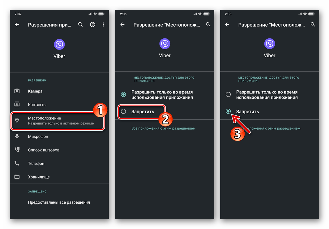 Выйдите из «Настройки» операционной системы. Отныне, когда Viber попытается получить доступ к данным о местоположении, вы получите уведомление о невозможности выполнения такого действия или запрос на разрешение мессенджеру доступа к форме геолокации, который необходимо отклонить.