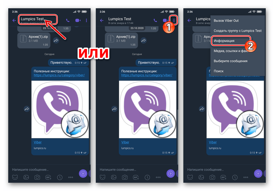 Коснитесь заголовка чата или откройте меню, нажав на три точки в правом верхнем углу и коснитесь в нем «Информация».