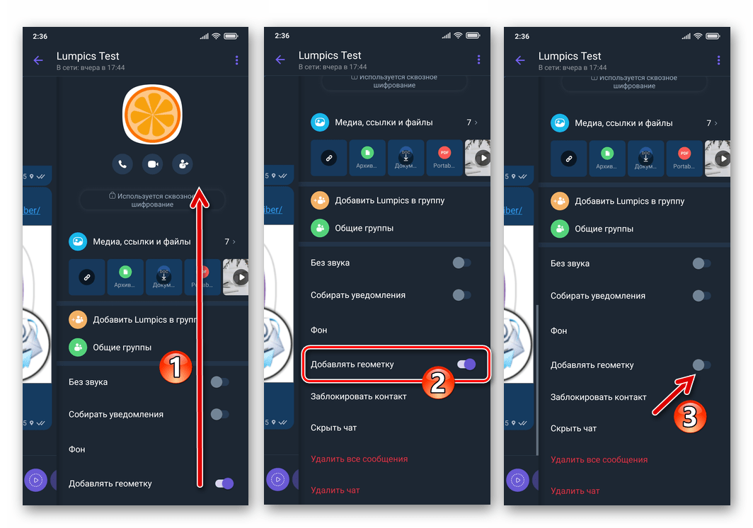 - Прокрутите список открывшихся настроек чата вверх, найдите название опции «Добавить геотег» и переместите переключатель, расположенный справа от него, в положение «Выкл».