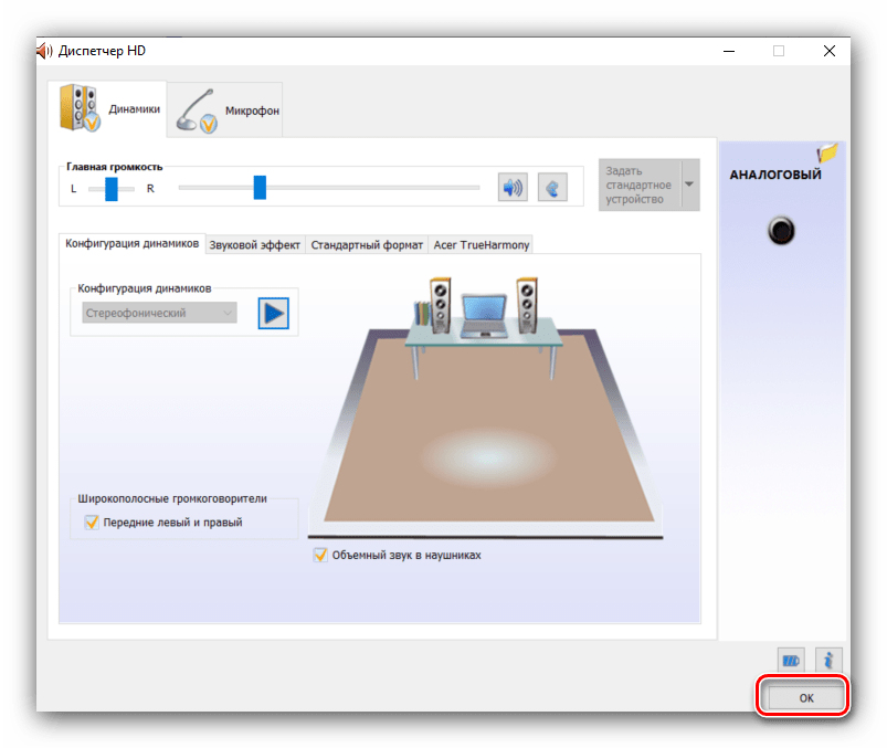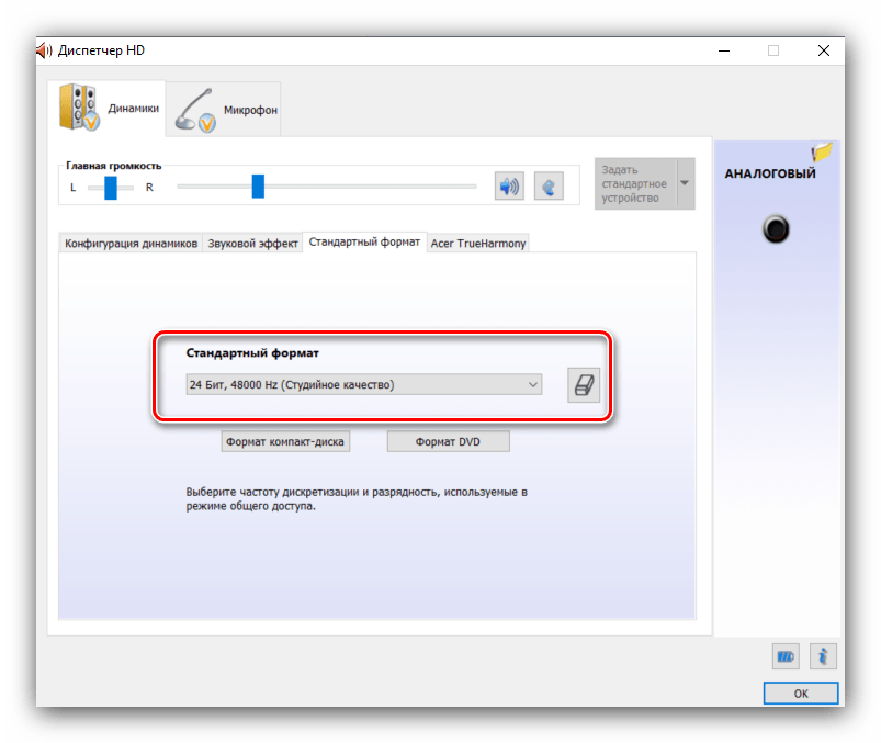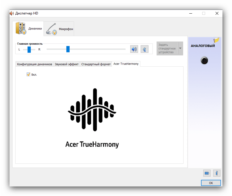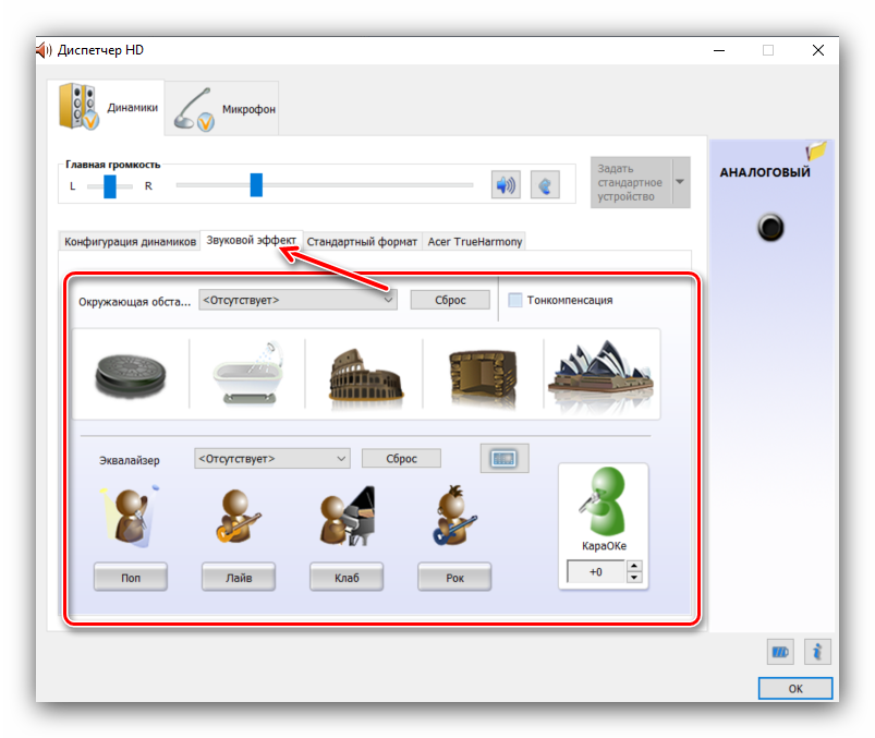 Как правило, диспетчер карты вывода звука предоставляет возможность более тонкой настройки, чем системная утилита. Возможности данного инструмента зависят от типа установленной платы. В качестве наглядного примера воспользуемся популярным решением Realtek HD.