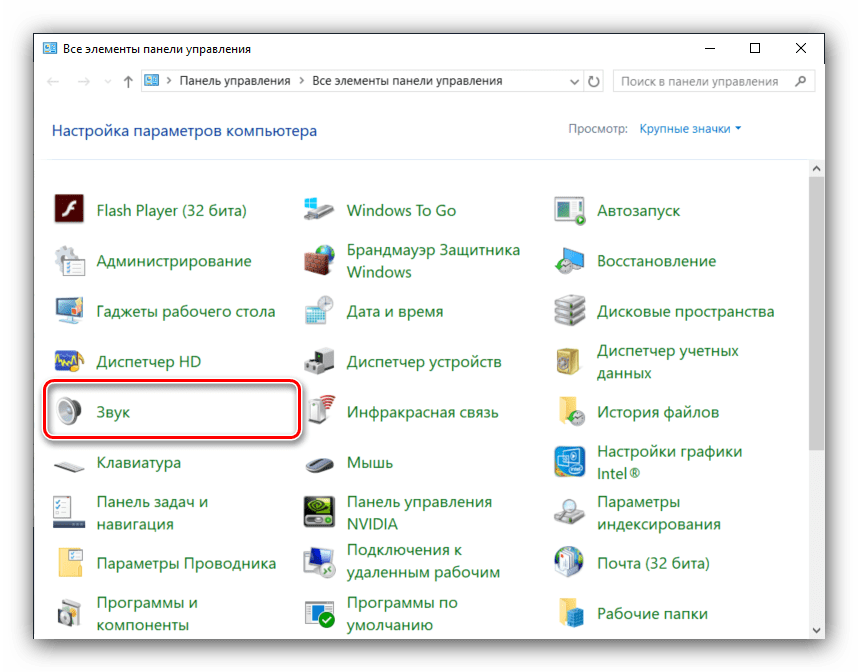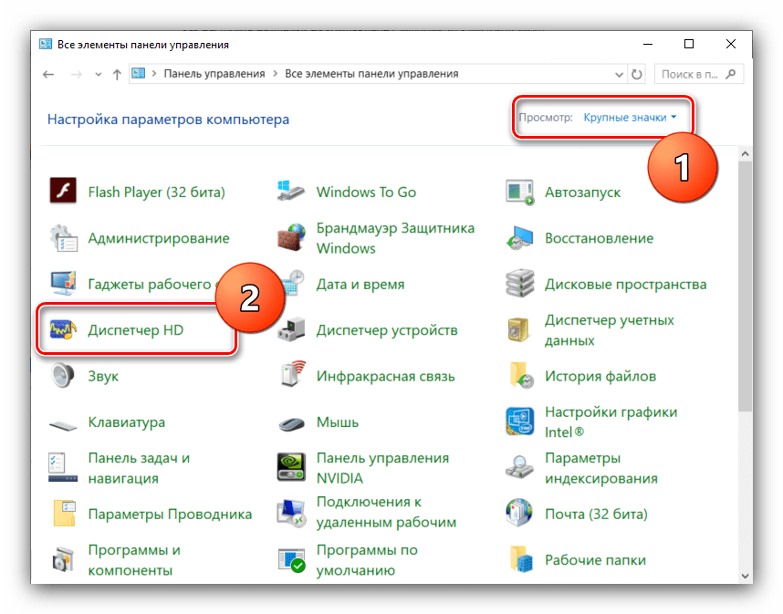 Подробнее: Как открыть «Панель управления» на Windows 10 Переключите отображение значков «Панели управления» в режим «Крупные», после чего найдите пункт под названием «Диспетчер HD» (может также называться «Диспетчер Realtek HD»).