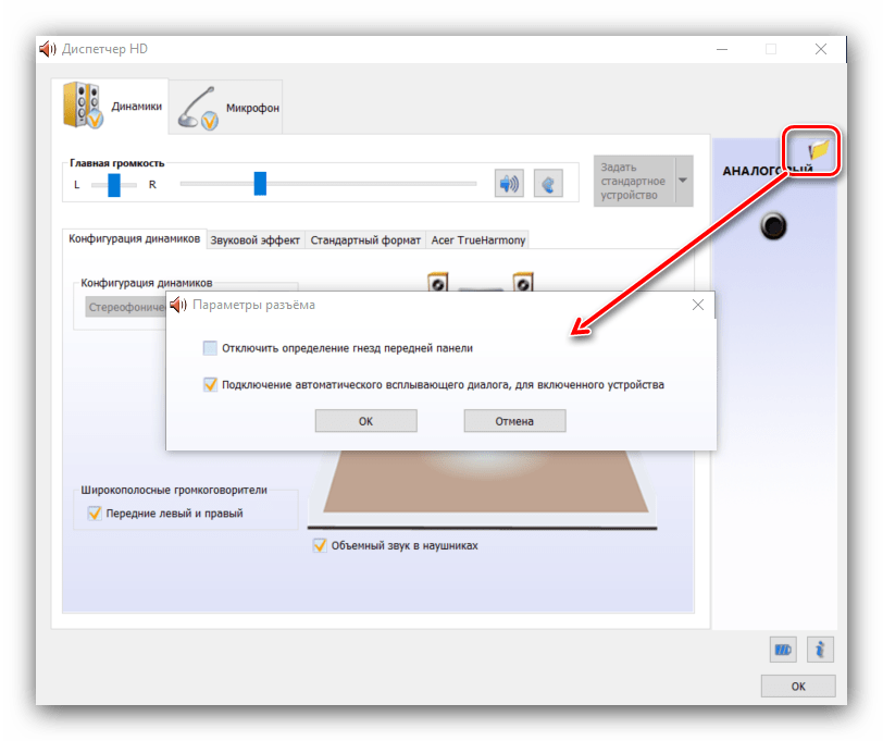 Для звуковых карт Realtek это также справедливо, но только в том случае, если для них установлено фирменное программное обеспечение для глубокого управления звуковой картой. Например, на скриншоте сверху видно, что в программе управления Realtek можно выбрать зелёное гнездо (к которому подключаются наушники) и задать ему режим работы «Наушники».