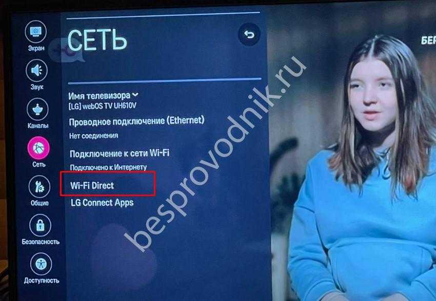Следующий вариант, как вывести экран телефона на телевизор LG, — использовать WiFi Direct. Для этого нужно, чтобы смартфон был на Андроиде не ниже 4 версии, а в ТВ был встроен Вай-Фай модуль.