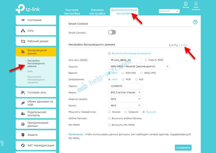 Там же могут быть настройки функции Smart Connect. Если она включена, то устройства будут видеть одну сеть и сами выбрать диапазон для соединения. Имя сети и пароль будут установлены одинаковые для обеих диапазонов.