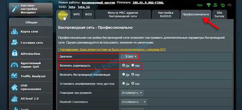 Отключить или включить 5 ГГц можно на вкладке «Профессионально». Выбираем нужный диапазон и ниже возле пункта «Включить радиомодуль» ставим «Да» или «Нет».