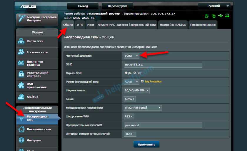 Изменить параметры Wi-Fi сети диапазона 5 ГГц на роутере ASUS можно в веб-интерфейсе, в разделе «Беспроводная сеть». Там в выпадающем меню нужно выбрать частотный диапазон «5GHz», задать нужные параметры и сохранить настройки. Если не знаете как зайти в настройки роутера ASUS — смотрите эту статью.
