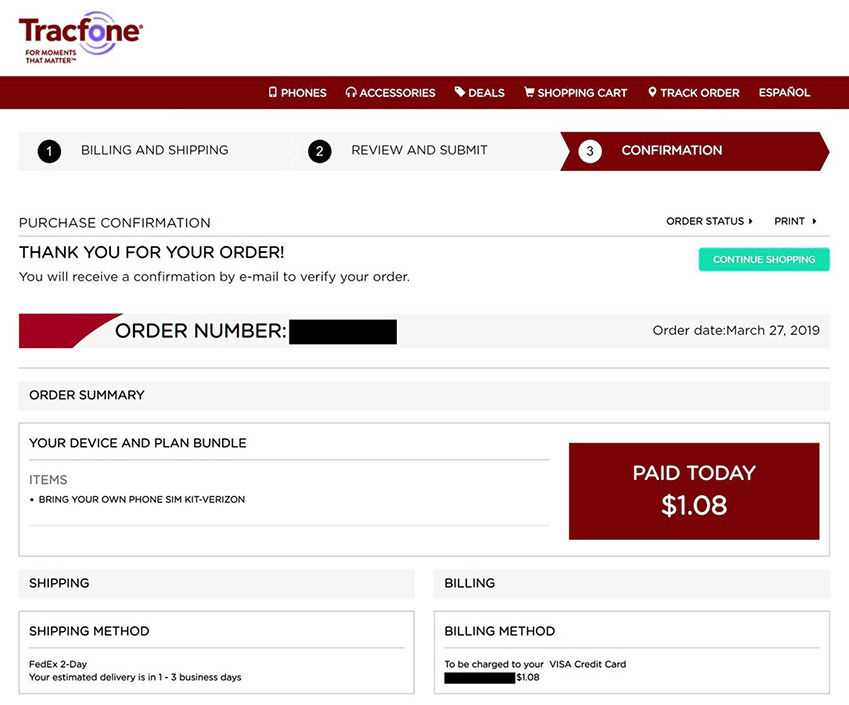 Те, кто находится на территории США, могут приобрести дешевую SIM-карту Tracfone всего за 1 доллар (или немного дороже). Если вы не можете купить дешевую SIM-карту и очень обеспокоены безопасностью своих личных данных, тогда вам следует отказаться от эксперимента, описанного в этой статье (либо воспользоваться альтернативными онлайн-сервисами для покупки телефонных номеров, обеспечивающих анонимность и конфиденциальность пользователей). Я приобрел SIM-карту Tracfone, оплатив покупку со своей банковской карты. Поскольку я использую старый смартфон с новой учетной записью Gmail, меня не сильно беспокоит защита моих личных данных. Картинки ниже подтверждают мою покупку, а также демонстрируют «набор», необходимый для проведения эксперимента.