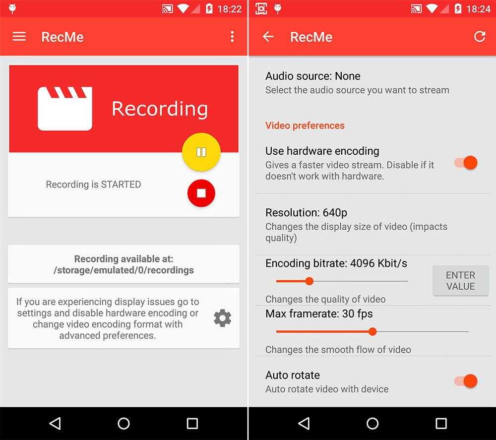 Запись можно вести в двух форматах — MP4 или MKV, с помощью аппаратного или программного кодека. Управление процессом записи можно вести как из самой программы, с помощью виджета (присутствуют кнопки Start, Pause, Stop), так и с экрана уведомлений.