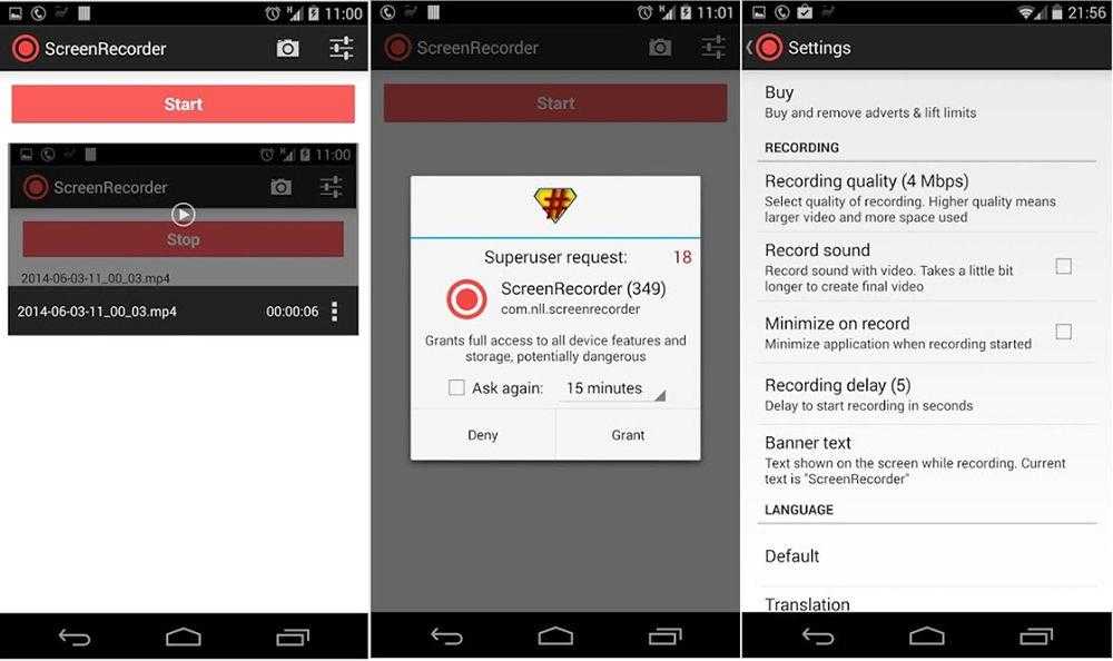 Еще одно отличное приложение для съемки экрана. Помимо записи видео, позволяет создавать скриншоты. Есть много дополнительных настроек. Желающие могут приобрести премиум-версию, которая предоставляет персонализированную плавающую кнопку, запись с внутреннего динамика и отсутствие рекламы. Работает без root-прав, как и вышеуказанные программы.