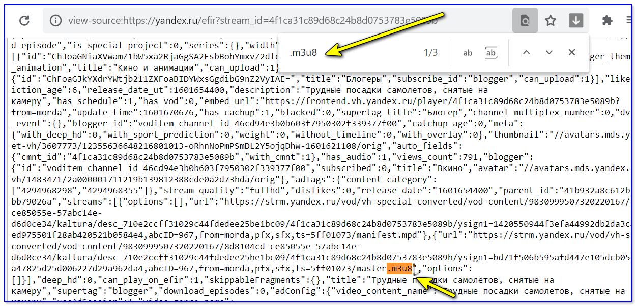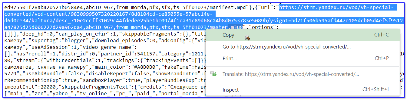 На эту аббревиатуру заканчивается код ссылки (URL), который нам нужен. См. внимательно на скриншоты ниже : я показал, что нужно выделить участок ссылки от «.m3u8» до «https» и скопировать его!