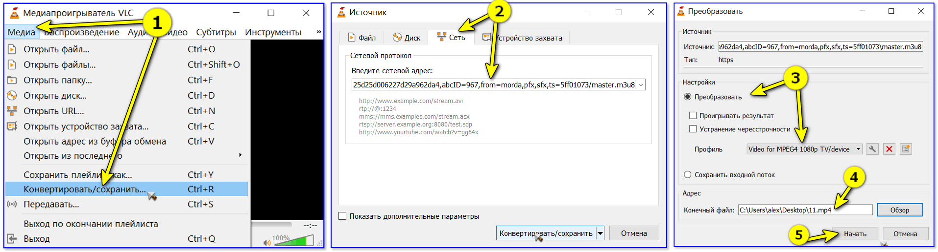 После его запуска, переходим в меню «Конвертировать. « (Ctrl+R), затем во вкладку «Сеть» и вставляем туда нашу ссылку, нажимаем кнопку «Конвертировать» (см. стрелку-2).