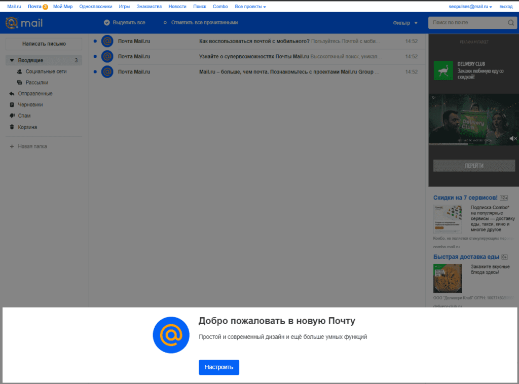 Отобразится почтовый ящик с письмами. На этом создание аккаунта завершено.