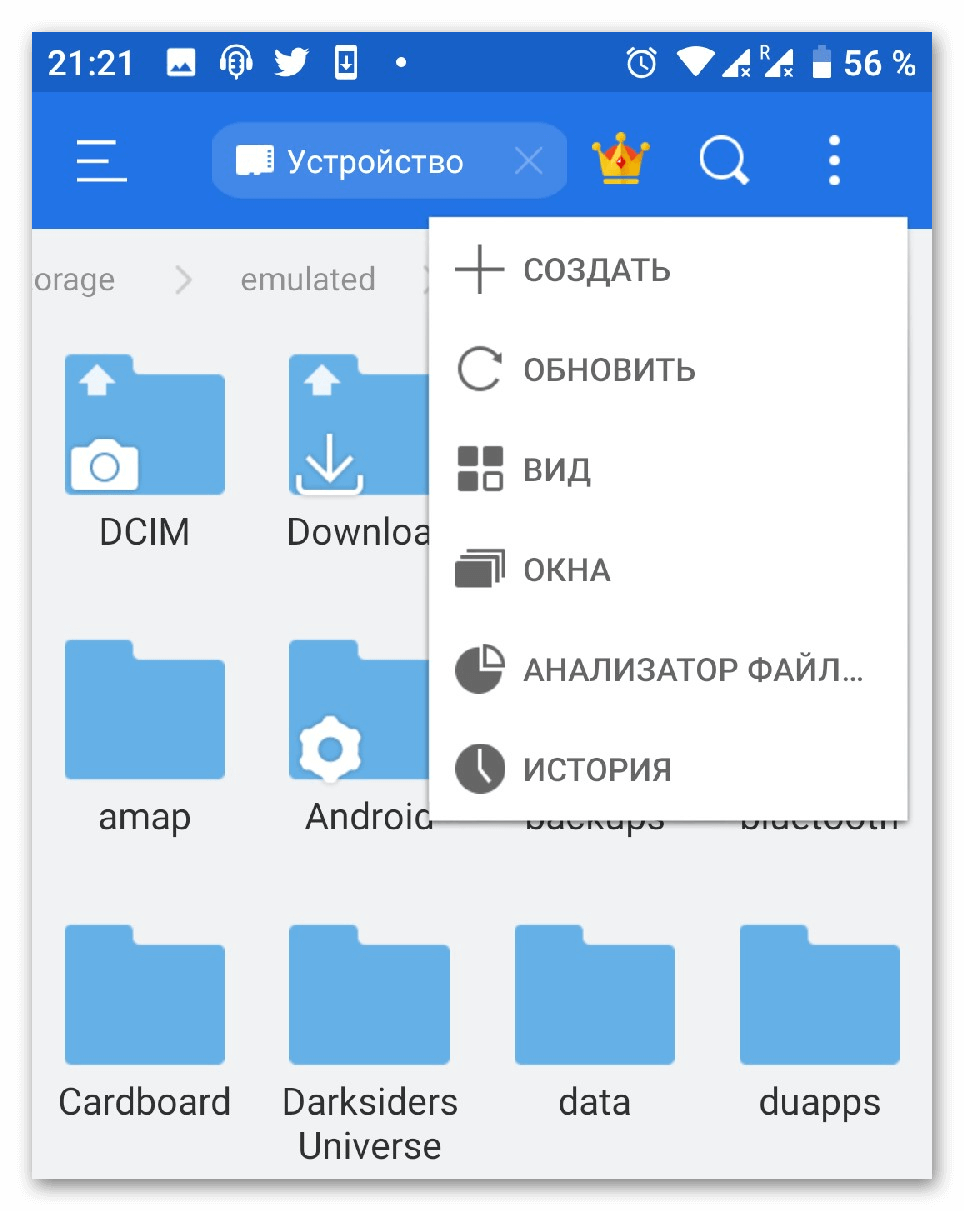 Помимо рабочего стола и лаунчера, у пользователя смартфона есть доступ к накопителю, на котором хранятся все данные устройства. Может возникнуть необходимость создания папки именно здесь. Как правило, на смартфонах установлен «родной» файловый менеджер и можно воспользоваться именно им. Однако иногда приходится устанавливать дополнительное ПО.