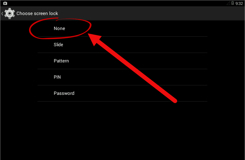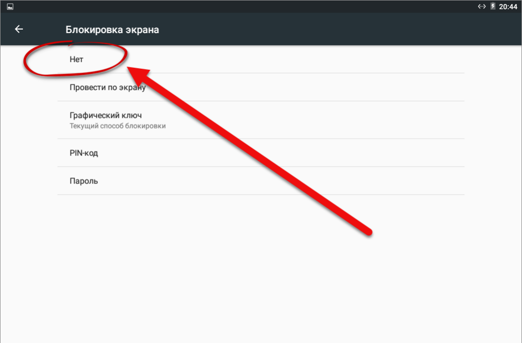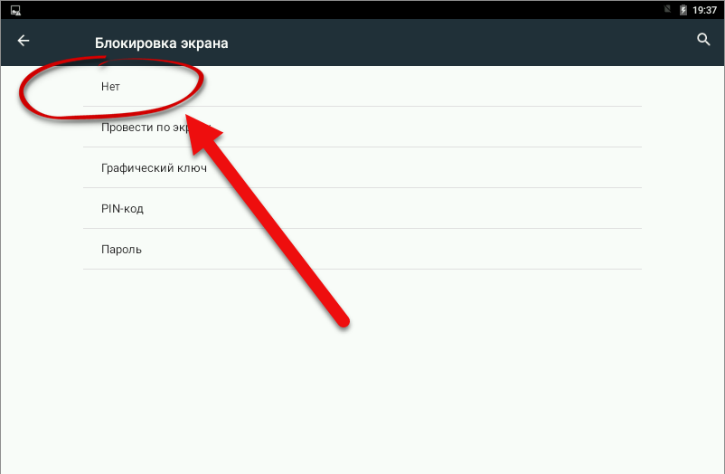 Среди всех вариантов установления шифра на экран, вы увидите пункт «Нет» — эта строка убирает все параметры блокировки и убирает их с телефона. Нажмите, чтобы продолжить.